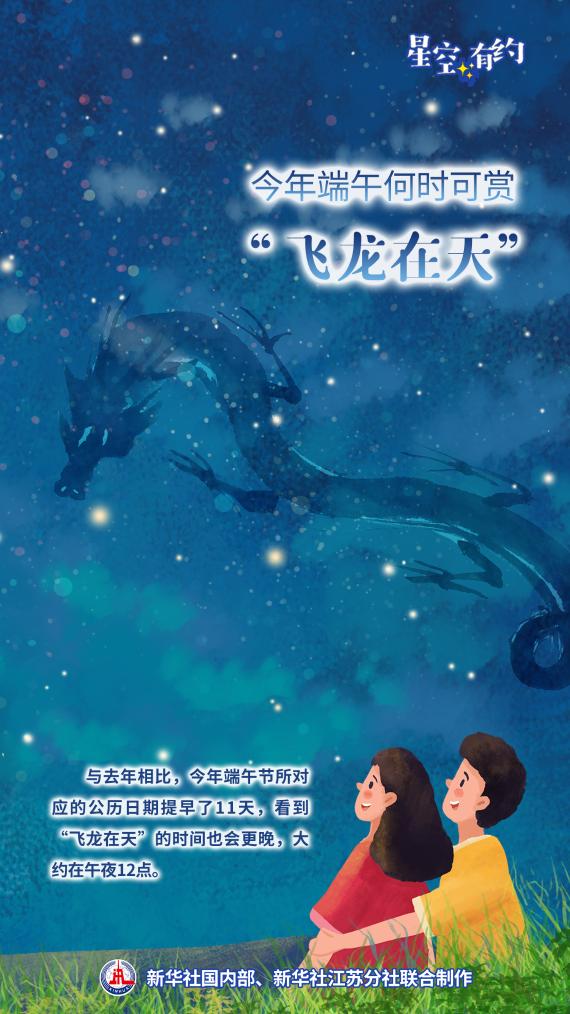 新華社南京5月29日電(記者王玨玢、朱筱)5月31日迎來端午節。當晚9時左右,蒼龍七宿的“龍頭”角宿會升至正南中天,到午夜12時左右,整條蒼龍的“龍形”會橫亙在夜空中,亦稱“飛龍在天”。