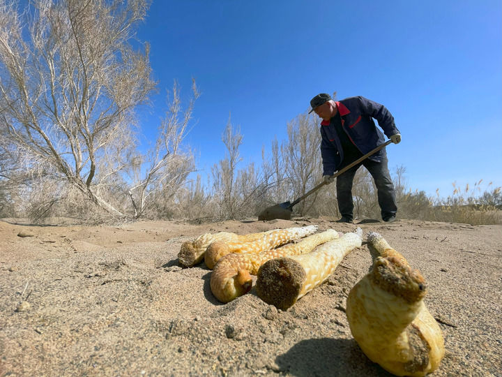在張掖市臨澤縣蓼泉鎮,綠盈家庭林場的職工魯志國在采挖肉蓯蓉(4月9日攝)。