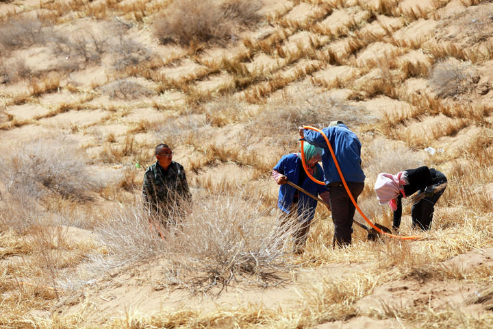 在張掖市臨澤縣北部沙區,臨澤縣治沙林場場長楊向剛(左一)在和當地人一起治沙(4月9日攝)。