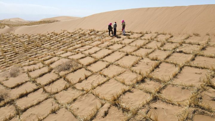 開溝、鋪草,打造草方格,再種上梭梭、檸條等沙生植物。在民勤等河西走廊沙區,人們這樣在沙上鋪草方格,方格內再種上沙生植物。沙障連“格”成“網”,沙丘就逐漸被固定住了。