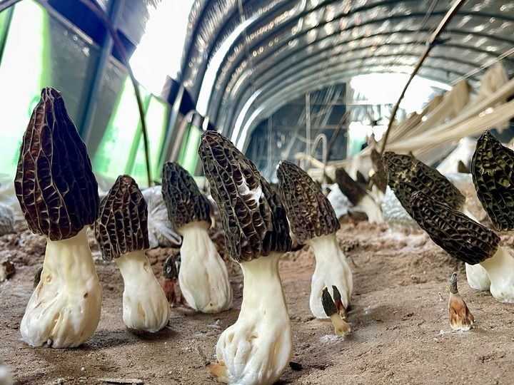 在張掖市臨澤縣的甘肅鴻澤農業開發有限公司的沙產業種植基地,羊肚菌長勢良好(4月9日攝)。