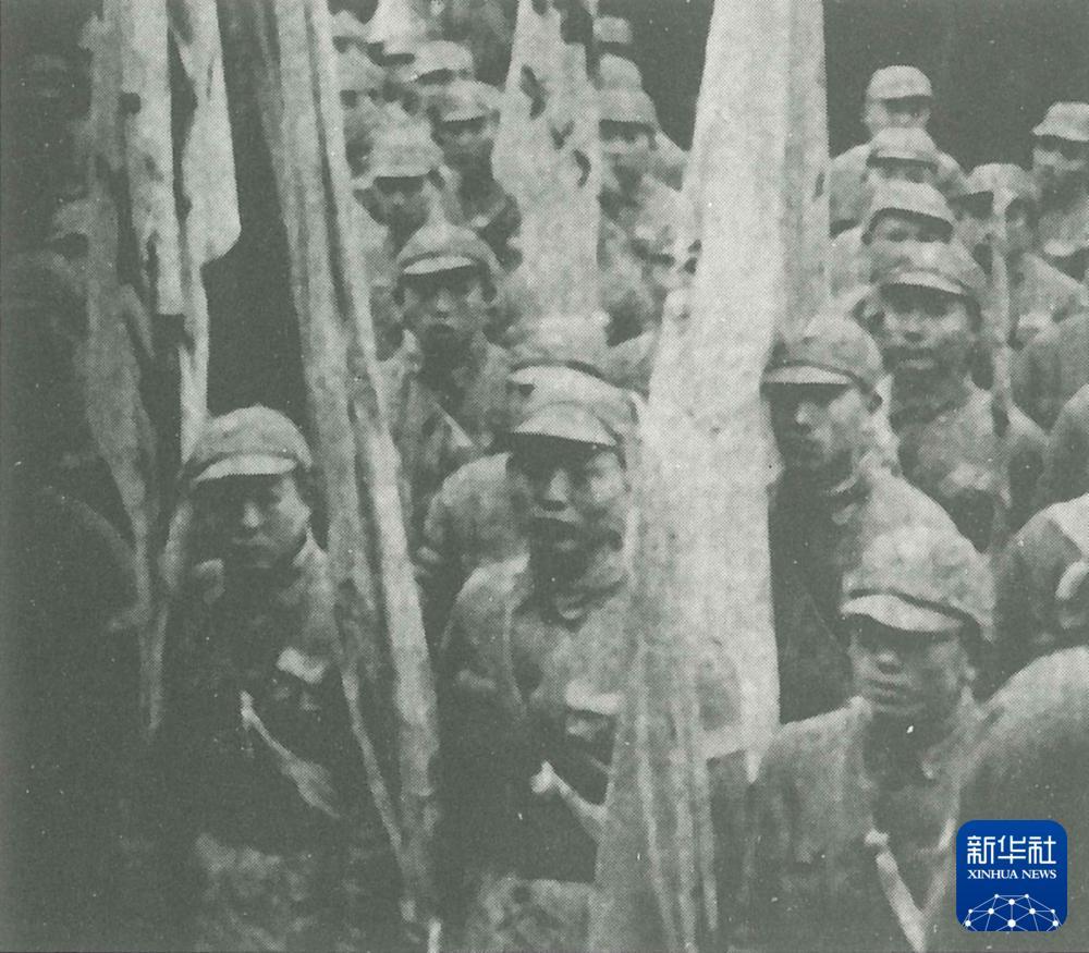 圖為扛著“精忠報國”旗的川軍將士出川遠征。
