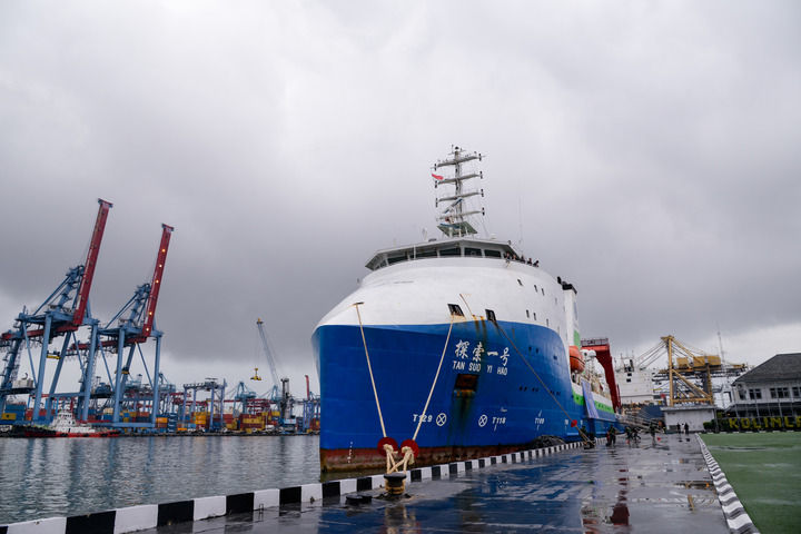 這是2024年3月22日在印度尼西亞雅加達拍攝的??吭诘と植宦蹈鄣摹疤剿饕惶枴笨瓶即?。中國科學院深??茖W與工程研究所與印度尼西亞國家研究創新署2024年3月23日順利完成為期一個月的爪哇海溝聯合科考。新華社記者 徐欽 攝