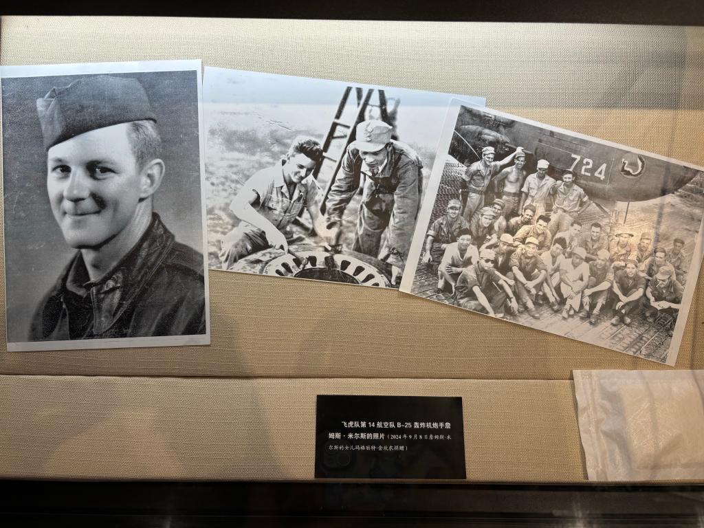 在紀念館新設的一個展柜里,擺放著飛虎隊老兵后人瑪格麗特·金坎農2024年捐贈的三張照片:一張是她父親的肖像照,另兩張是她父親當年和中國飛行員、技術人員的合影。