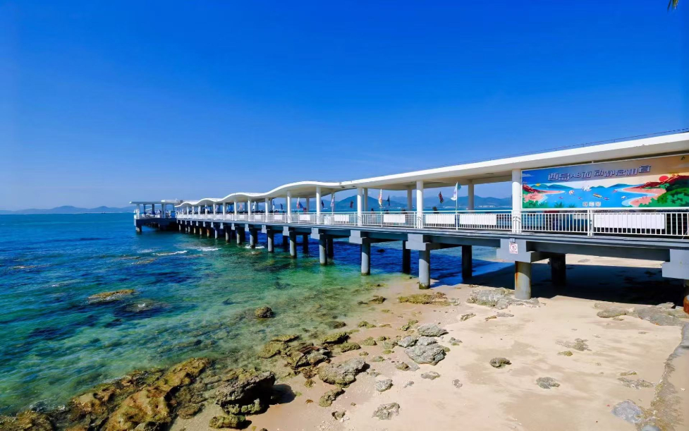 海南三亞,西島的浪花輕輕拍打著生態棧道,珊瑚礁間游弋的熱帶魚群折射出粼粼波光。
