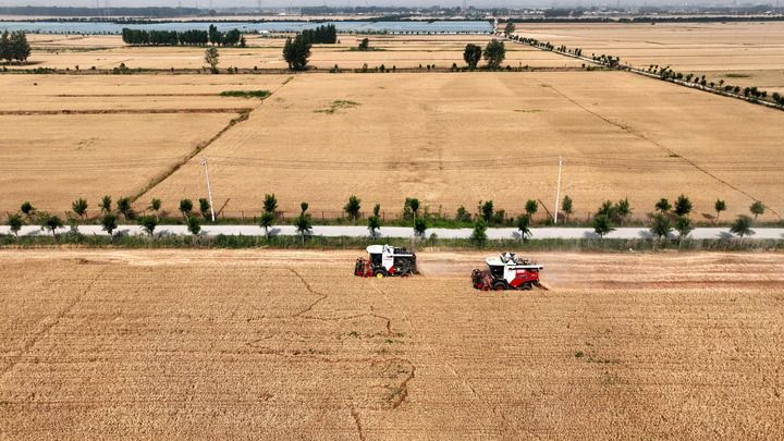 2025年6月12日,在青島西海岸新區大場鎮的麥田里,聯合收割機在收割小麥(無人機照片)。新華社記者 李紫恒 攝