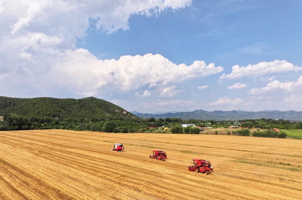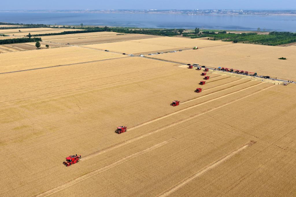 2025年5月28日,在山西省運城市鹽湖區解州鎮曲村麥田里,農機手駕駛收割機收割小麥。新華社記者 詹彥 攝