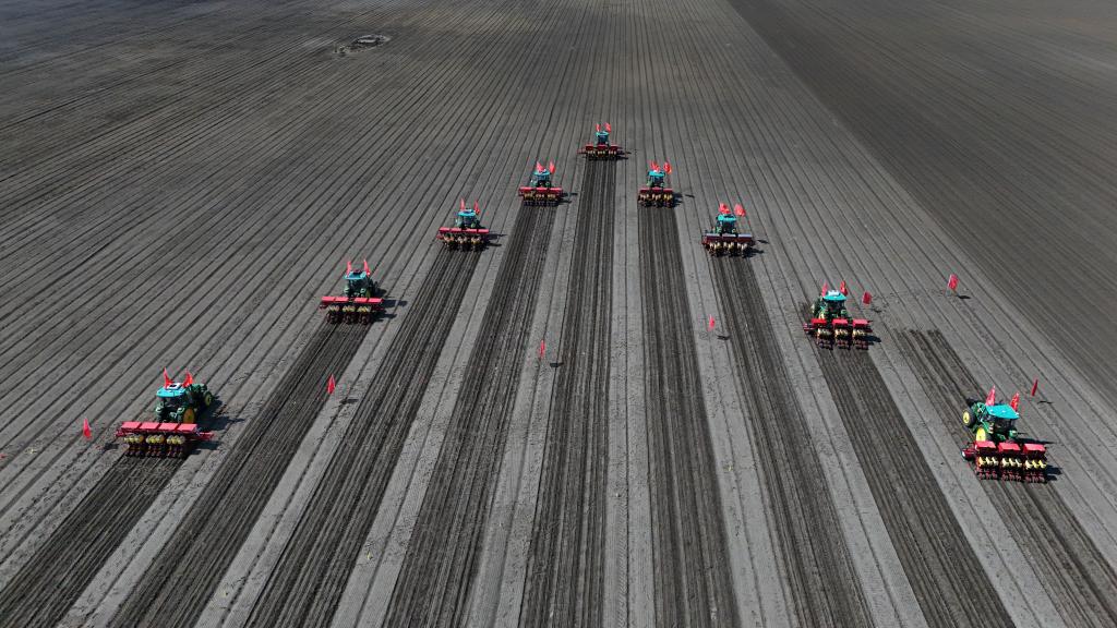 2025年5月8日,在黑龍江雙鴨山一旱田地塊,大馬力農業機械準備在黑土地上進行大豆播種作業。新華社記者 王松 攝