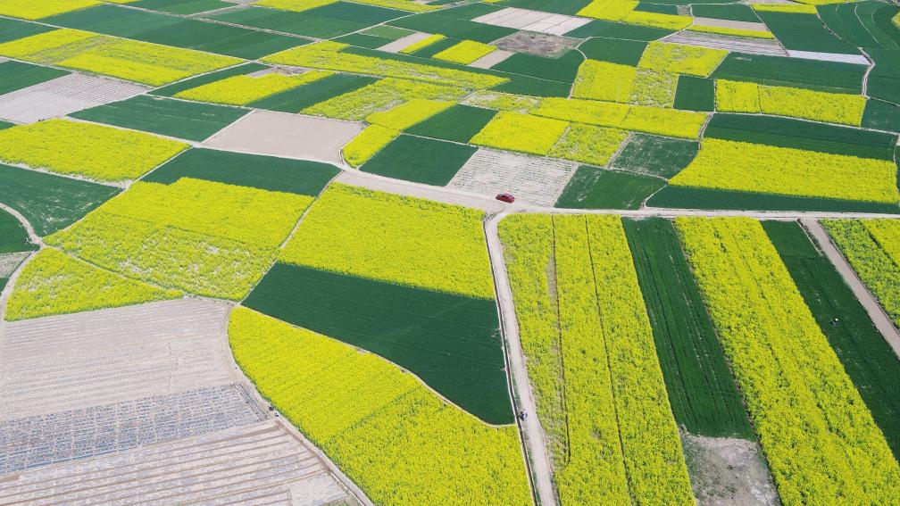 2025年4月25日在位于黃土高原的甘肅省天水市武山縣拍攝的油菜花田。新華社發(王克賢攝)