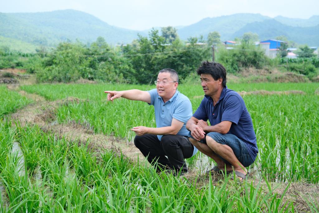 白竹村駐村第一書記莫日發(左)正在指導村民進行田間管理。新華社記者 鄒雨沁 攝