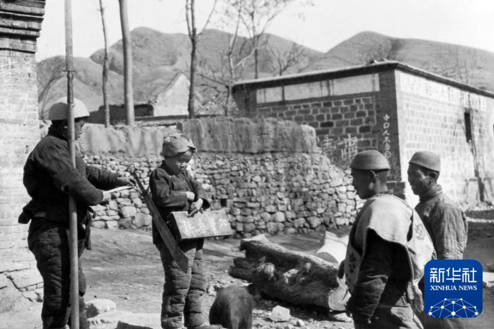 抗戰時期,敵后抗日根據地兒童團的孩子在站崗放哨時教路過的鄉民識字“加緊春耕”。
