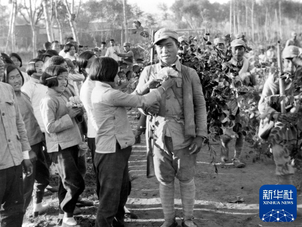 民眾為百團大戰勝利歸來的英雄戴光榮花。