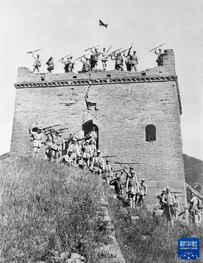 1940年8月,八路軍攻克河北淶源縣日軍據點東團堡,戰士們在長城烽火臺上歡呼勝利。