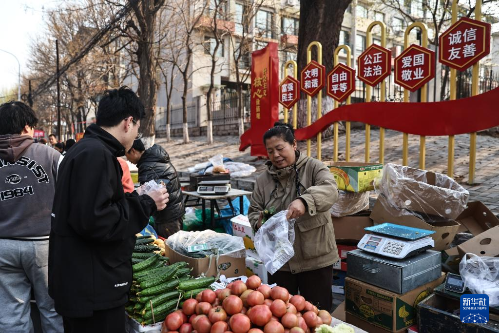 一名攤主在遼寧省錦州市石橋子早市售賣蔬菜(2025年4月15日攝)。新華社記者 潘昱龍 攝