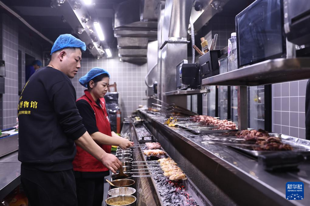 廚師在遼寧省錦州市一家燒烤店為食客烤制食材(2025年4月14日攝)。新華社記者 潘昱龍 攝