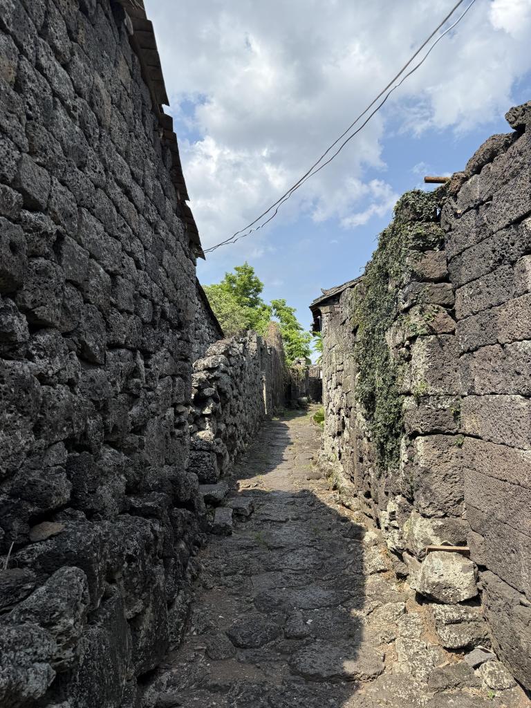 ??谑行阌^石山鎮三卿村——一座火山爆發遺跡上建起的古村落,便講述了古人因地制宜、順應自然建設家園的故事:平整的熔巖臺地成為房屋的基礎、黑色的火山巖是建屋的原料,火山土壤里長出的作物營養又高產……