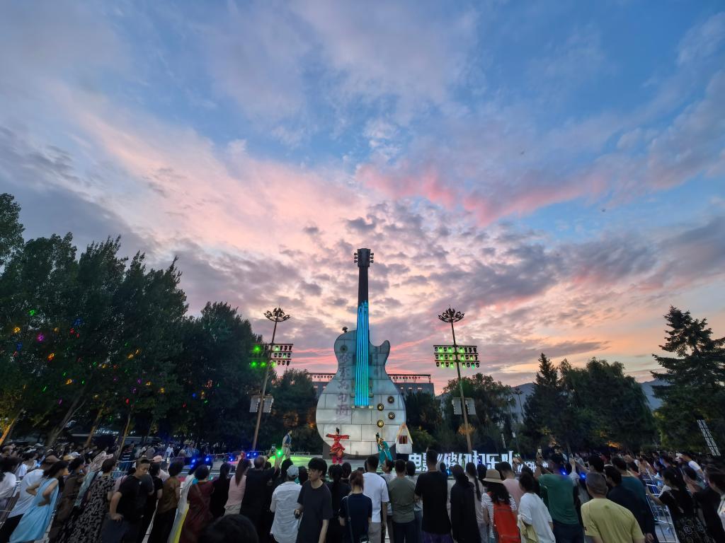 6月25日,人們在鴨綠江畔的大吉他音樂主題廣場觀看“夢縈高句麗”演出。新華社記者 孫鵬程 攝