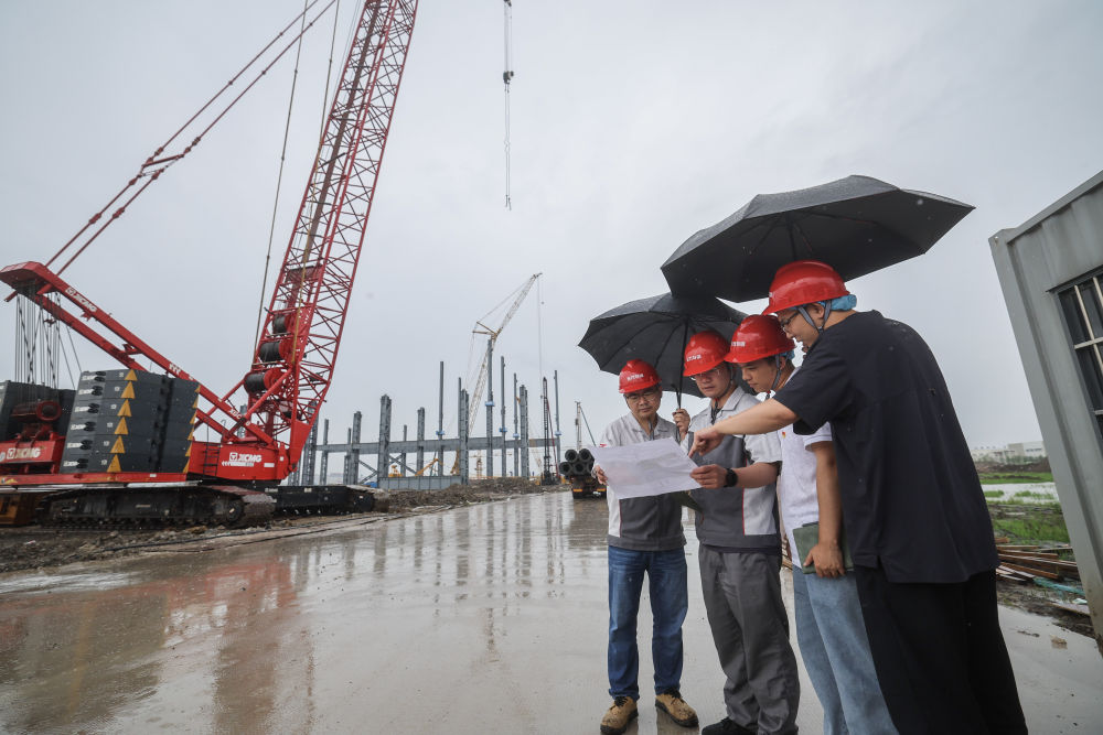 2025年6月10日,在東方特鋼鎳鉻新材智造項目建設現場,浙江省嘉興市南湖區駐企“紅色專班”黨員與企業施工方一起查看項目現場推進情況。新華社記者 徐昱 攝