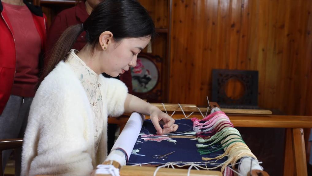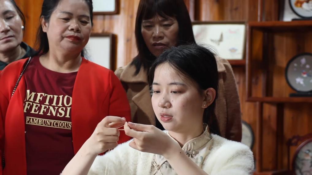 日前,在湖南省桃源縣鄭家驛鎮梨子崗村,1999年出生的肖瑤正領著周邊的婦女學習體驗桃源刺繡,帶動她們在家門口就業,增加收入。