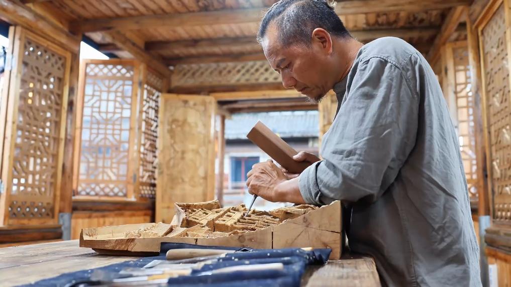 為尋找創作靈感,潘能輝行走在沅江之濱,目光停駐在靠岸的船只上,久久凝視著常德詩墻那斑駁的字跡,曾經的古河街,仿佛穿越歷史的重重塵埃,緩緩傳遞至他手中的刻刀。