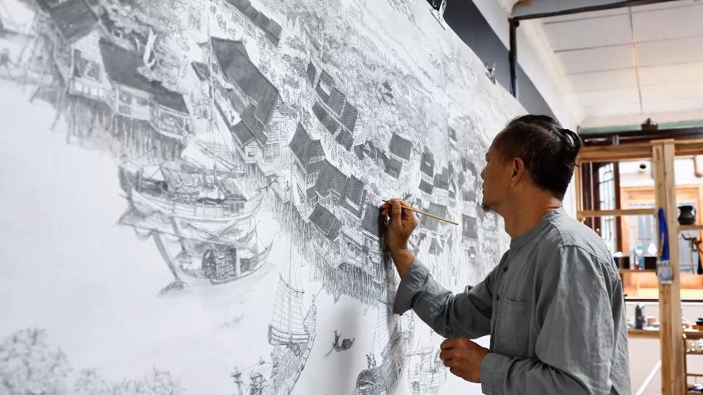 潘能輝以沈從文《湘行散記》為創作藍本,記錄家鄉的河流和風土人情,創作展現沅水流域等地風光與人文的巨型木雕。經過5年努力,他即將完成長25米、寬1.5米的水墨畫稿。