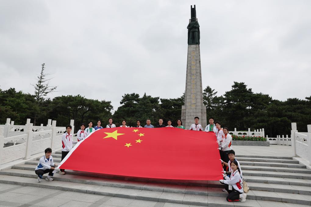 7月2日,在沈陽的抗美援朝烈士陵園,香港培僑中學的師生在紀念碑前展示五星紅旗。新華社記者 李鋼 攝