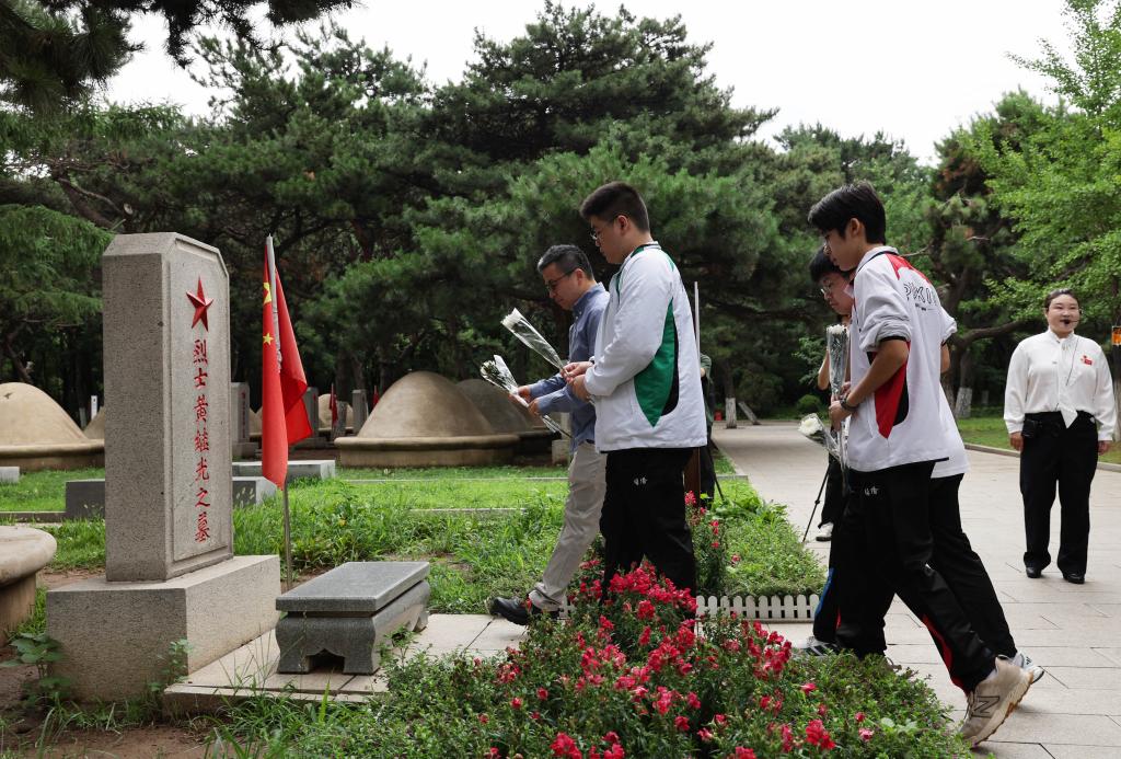 7月2日,在沈陽的抗美援朝烈士陵園,香港培僑中學校長伍煥杰和學生一起向烈士墓獻花。新華社記者 李鋼 攝