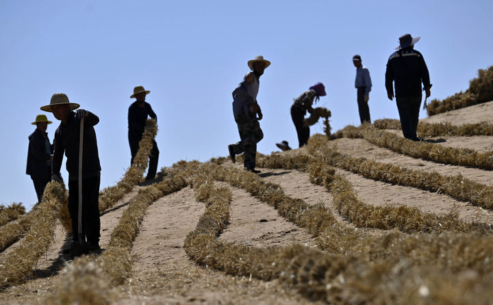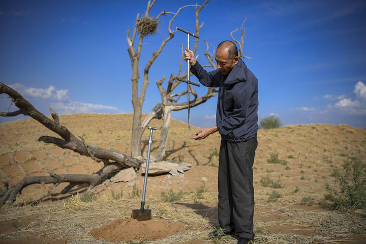 用鐵鍬將干草扎進沙里,地面保留15到20厘米自然豎立,這一米見方的草方格看似簡單,但寸草可遮丈風。桀驁不馴的流動沙丘被牢牢釘住,其間草木漸次繁榮,綠意從斑駁連成一片。