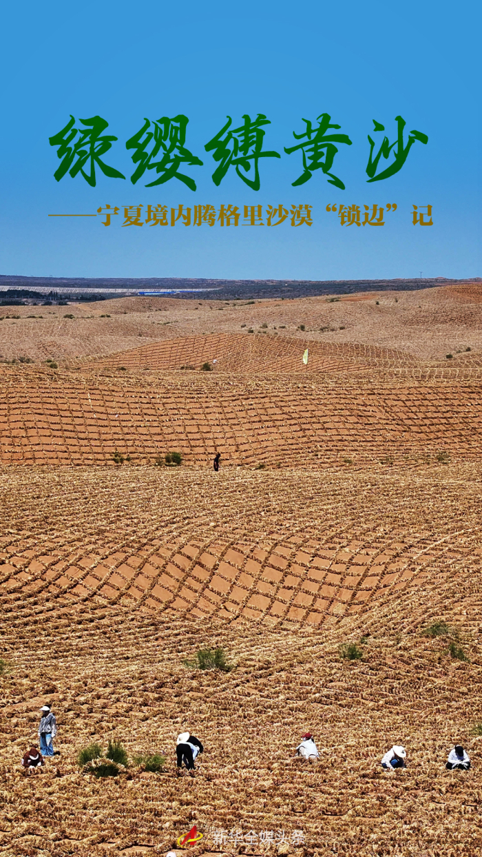 6月30日11時30分許,在寧夏中衛市沙坡頭區長流水村,工人們將最后一米草方格扎進沙子,寧夏境內騰格里沙漠固沙鎖邊帶最后的缺口被補齊,一眼望去,無數草方格像一張巨網,縛住連綿起伏的沙丘。