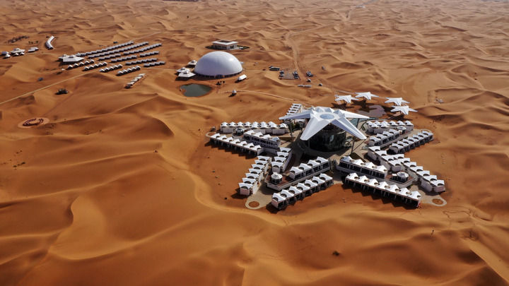 中衛市沙坡頭景區騰格里沙漠星星酒店(2023年7月20日攝,無人機照片)。新華社記者 王鵬 攝