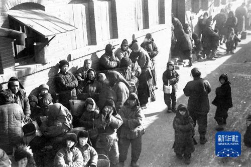 排隊等待施粥的沈陽貧民。日本占領時期的東北人民掙扎在饑餓線上。