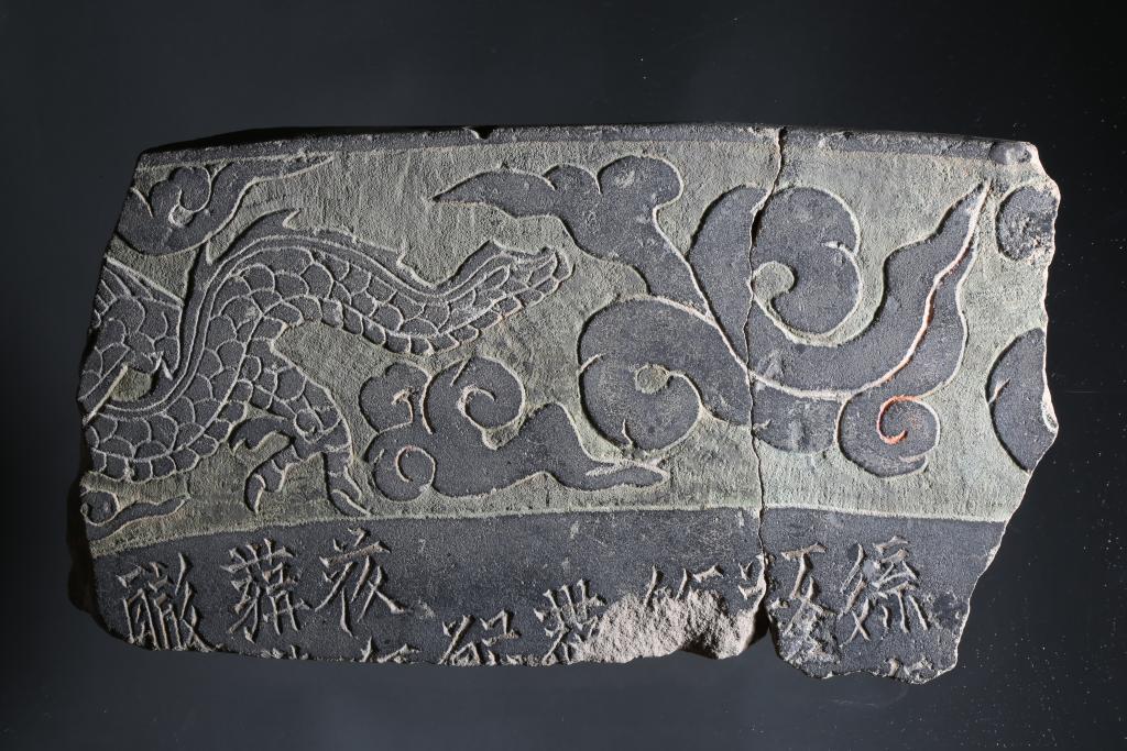 西夏文彩繪描金云龍紋灰砂巖殘碑。(銀川西夏陵區管理處供圖)
