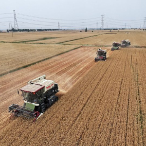 2024年6月7日,收割機在河北省邢臺市隆堯縣固城鎮東王村麥田里收獲小麥(無人機照片)。新華社記者 牟宇 攝