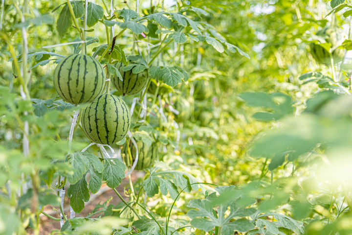2025年5月27日,在浙江省溫嶺市吉園果蔬合作社內,一個個圓潤飽滿的小西瓜懸吊半空。 徐偉杰拍攝(通聯照片)