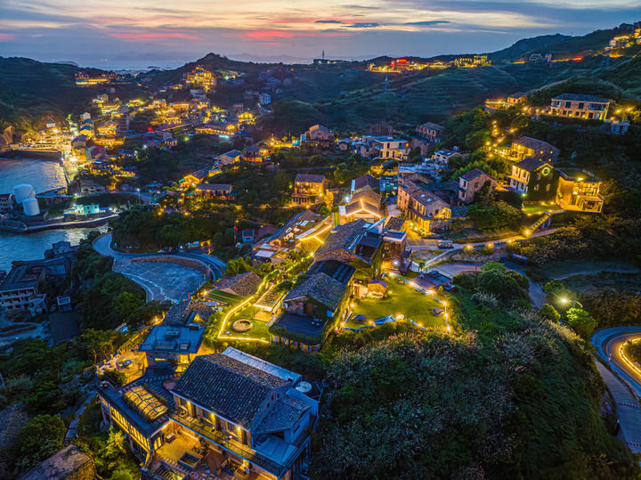 2024年7月2日,浙江省溫嶺市石塘鎮,暖黃燈火從錯落的民宿、庭院間漫溢,沿著山海輪廓流淌,勾勒出漁村特有的浪漫煙火(無人機照片)。徐偉杰拍攝