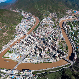 紅棕色的河水波濤洶涌,磚紅色的山脈連綿不絕。山水間的紅土地上,房屋、橋梁、廣場等帶有紅色裝飾的建筑錯落分布,將這座歷史悠久的藏東山城裝點成一幅立體的油畫。