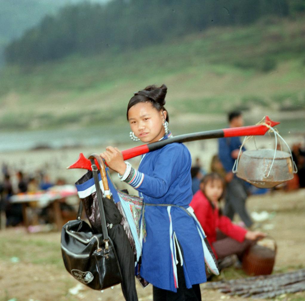 參加“花炮節”的侗族少女購得自己需要的物品滿載而歸。(1981年8月4日發)