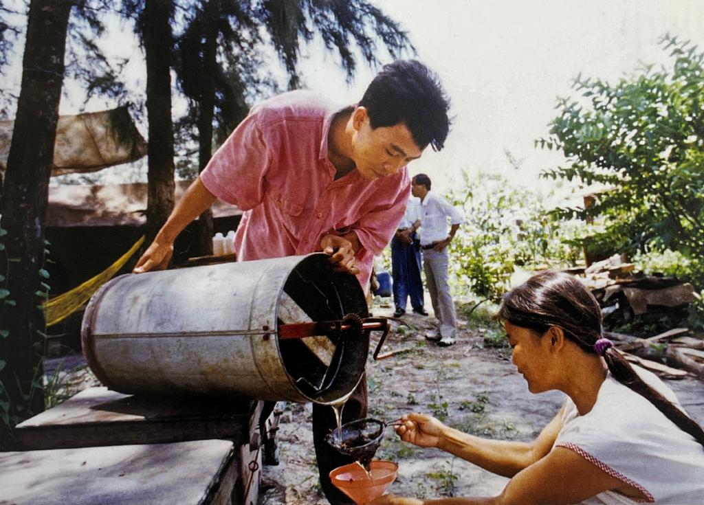 以養蜂為業的王勿民偕同妻子從老家浙江來到海南島靈山縣專事養蜂。雖然生活條件艱苦,但夫妻配合默契,養蜂成效好,日子過得很甜蜜(1999年攝)。