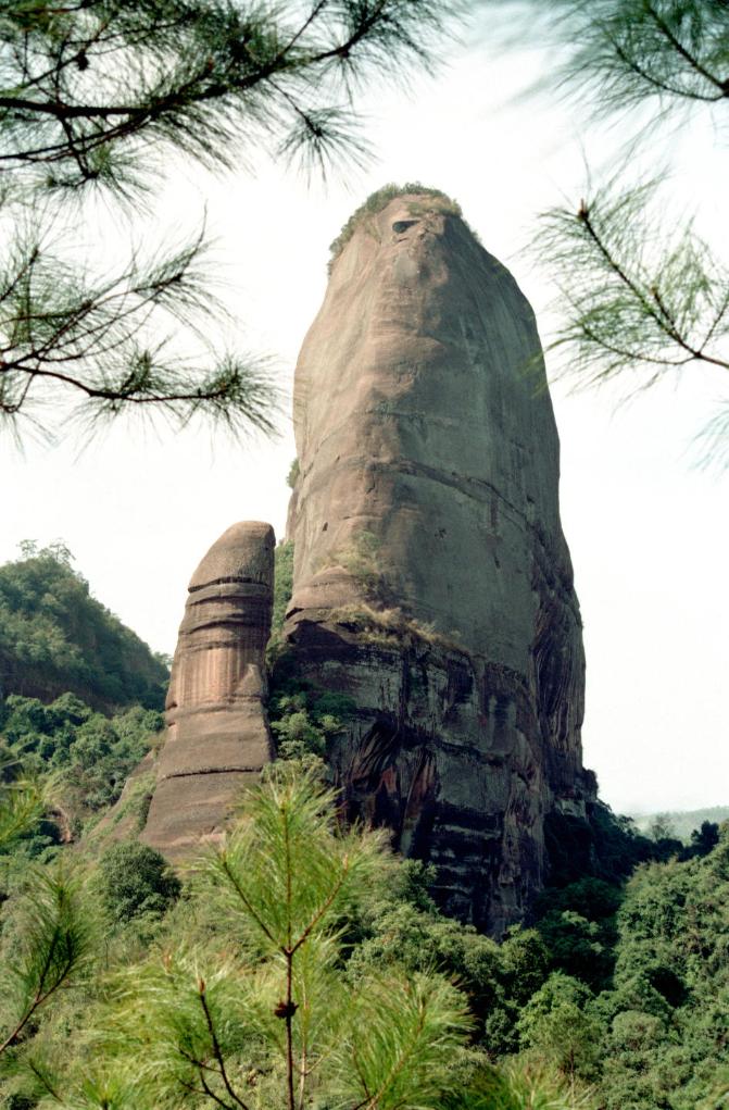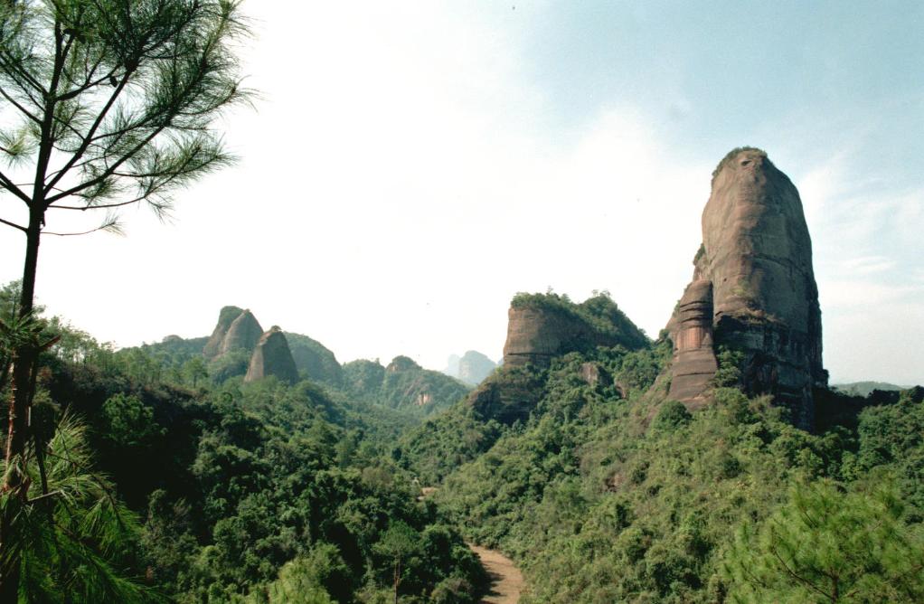 丹霞山是中國最古典的“丹霞地貌”的命名地,被譽為世界最大的“紅石公園”。這是“陽元石”周圍的地形地貌(1993年4月12日發)。