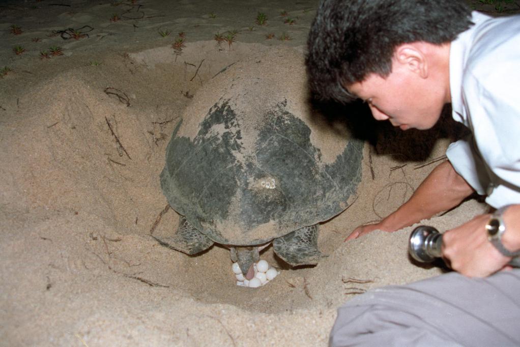 雌海龜從上沙灘產卵到返回大海。一般每只龜產卵約100多個。這是海龜在夜間產卵的情景。(1993年11月27日發)。