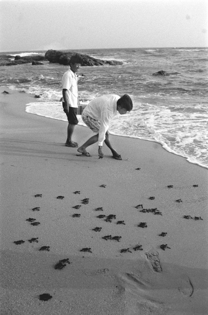 圖為海龜自然保護區的工作人員把人工孵化和自然孵化的幼龜,集中精養30-150天后再放歸大海,這樣可以提高幼龜的成活率。(1993年11月27日發)