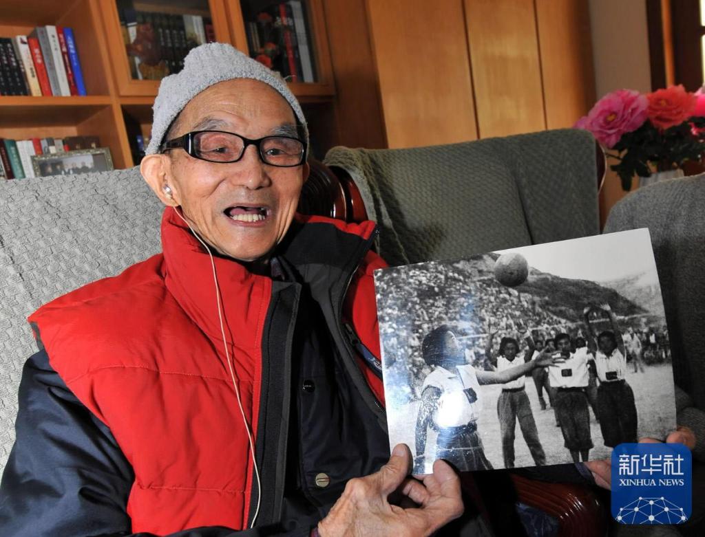 2008年4月3日,徐肖冰老人向記者介紹他1943年在延安拍攝的延安大學女子排球隊比賽時的照片。新華社記者 何俊昌 攝