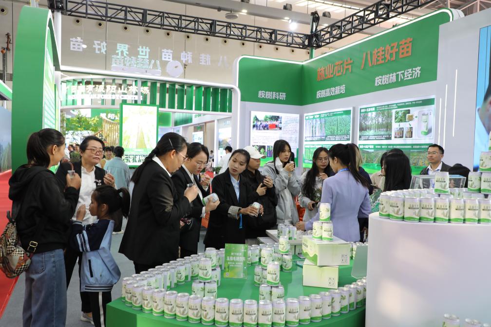 在2024年世界林產品及木制品展上,嘉賓正在品嘗廣西國有東門林場研發的五指毛桃營養飲料。(受訪者供圖)