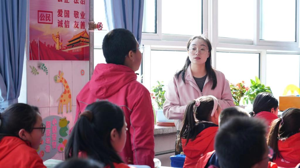 在靜寧縣德順小學的教室里,武媛媛在課堂上與學生互動。(受訪者供圖)