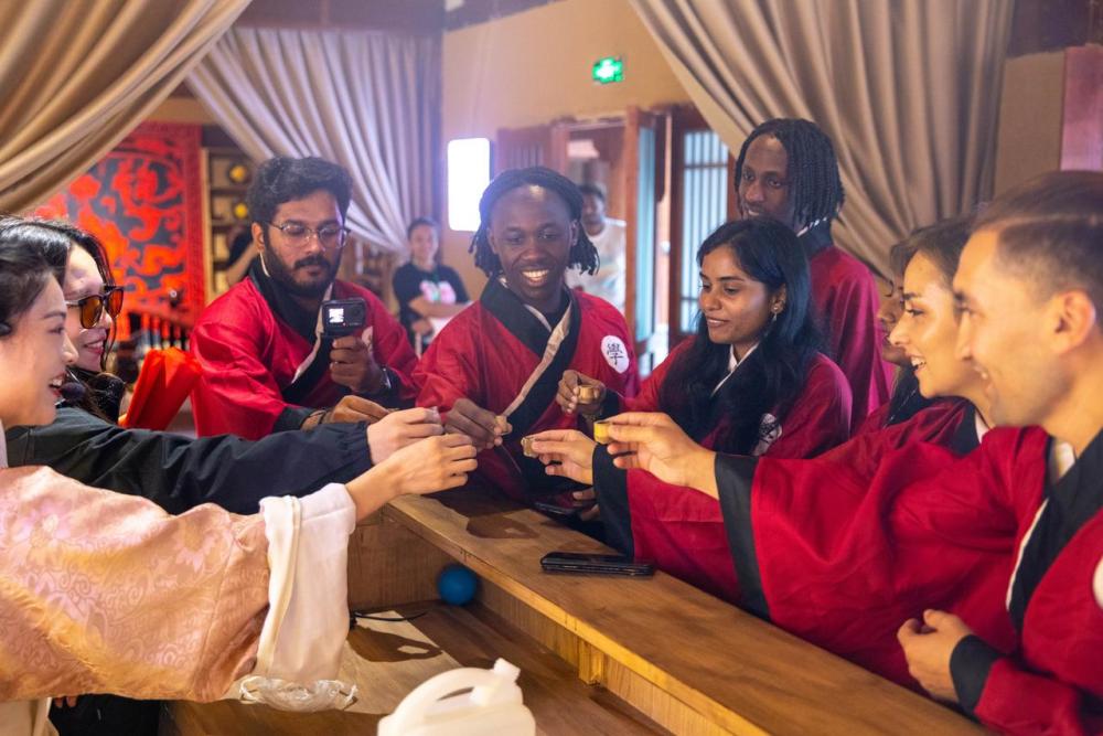 圖為國外昭君文化愛好者在昭君村品嘗傳統土法釀造的美酒。(興山縣委宣傳部供圖)