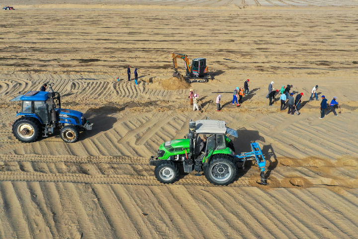 工作人員在新疆巴音郭楞蒙古自治州且末縣唐農萬物(且末)生態科技試驗基地種植苗木(2025年4月9日攝,無人機照片)。新華社記者 丁磊 攝