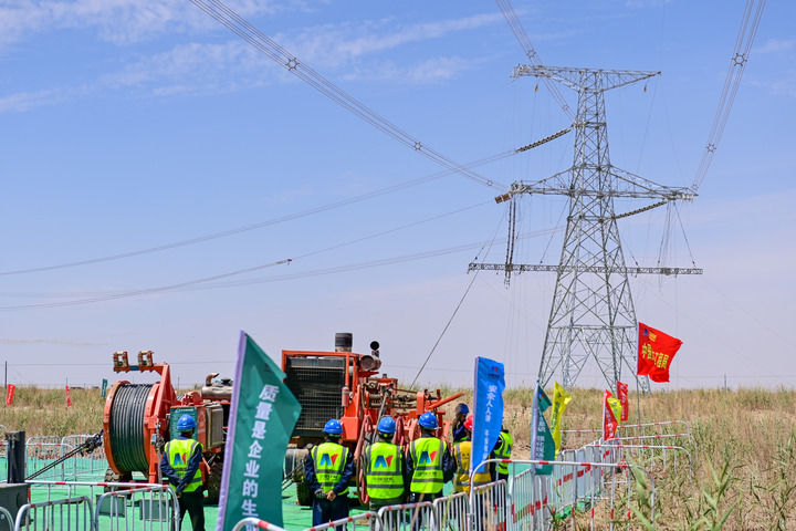 施工人員在新疆和田地區民豐縣架設民豐—且末750千伏線路最后一段電線(2025年7月13日攝)。新華社記者 丁磊 攝