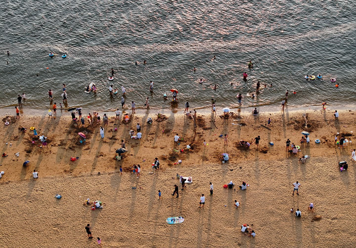 市民和游客在防城港市西灣旅游景區沙灘浴場游玩(7月6日攝,無人機照片)。新華社記者 黃孝邦 攝