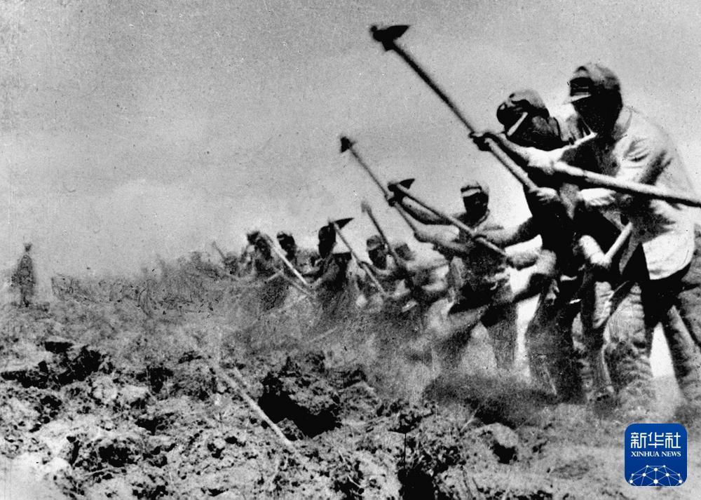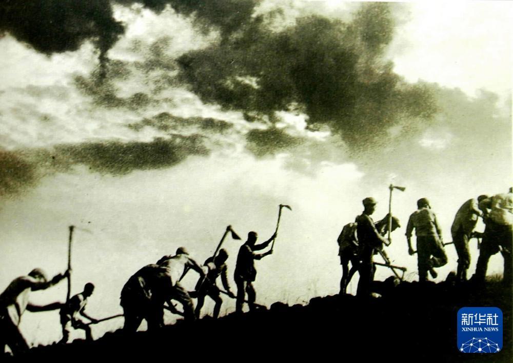八路軍戰士在南泥灣開荒生產。新華社發