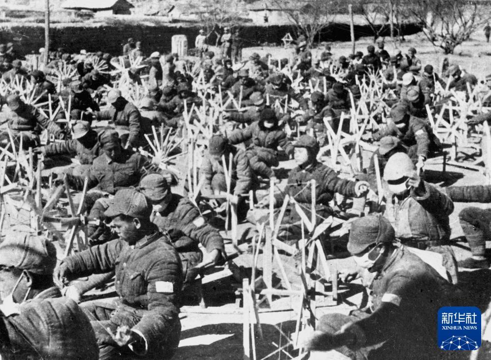 八路軍戰士坐在紡紗車前紡紗。新華社發